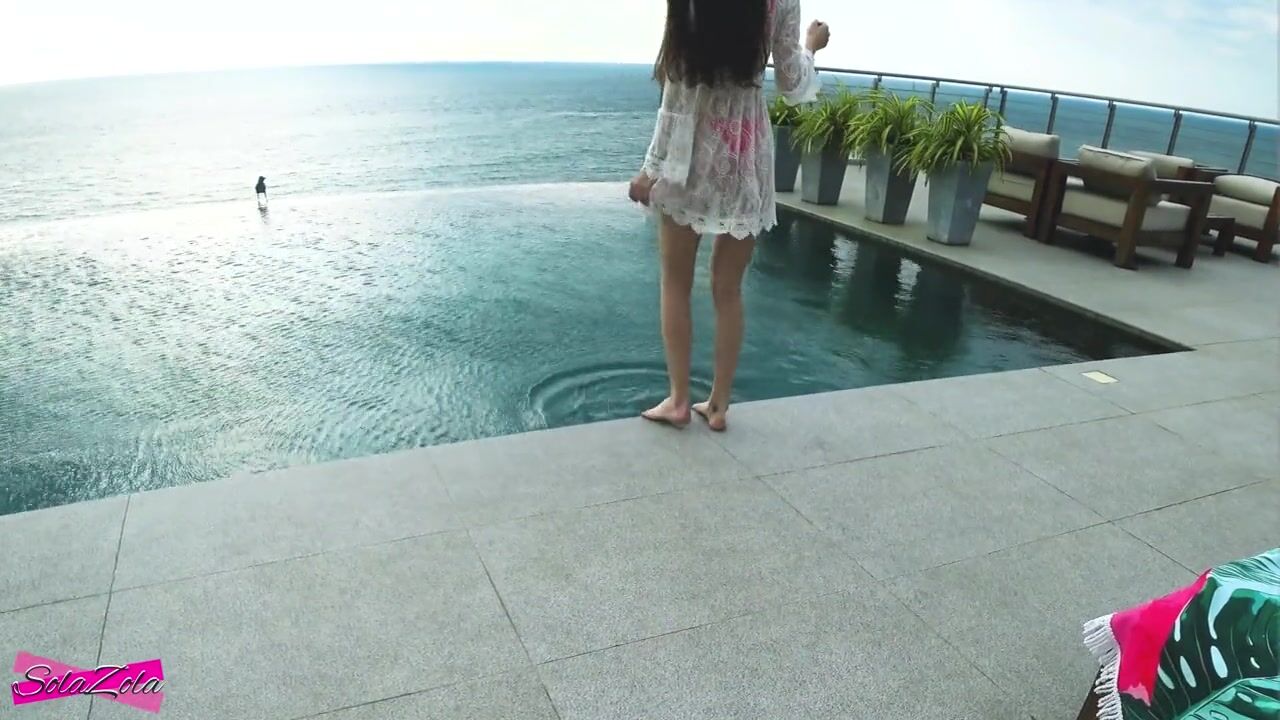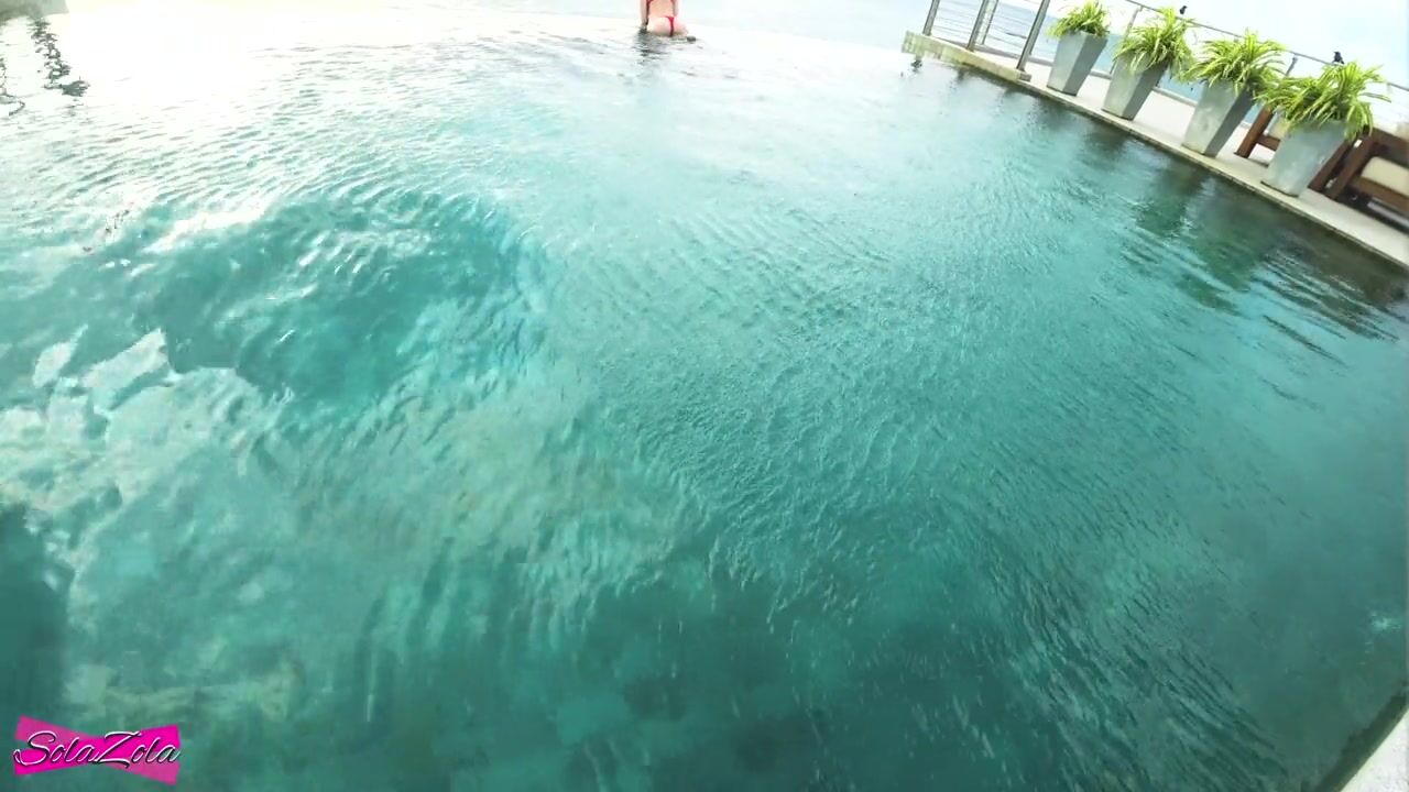 Молодая телка возле бассейна делает шикарный минет своему парню заглатывая его член полностью
