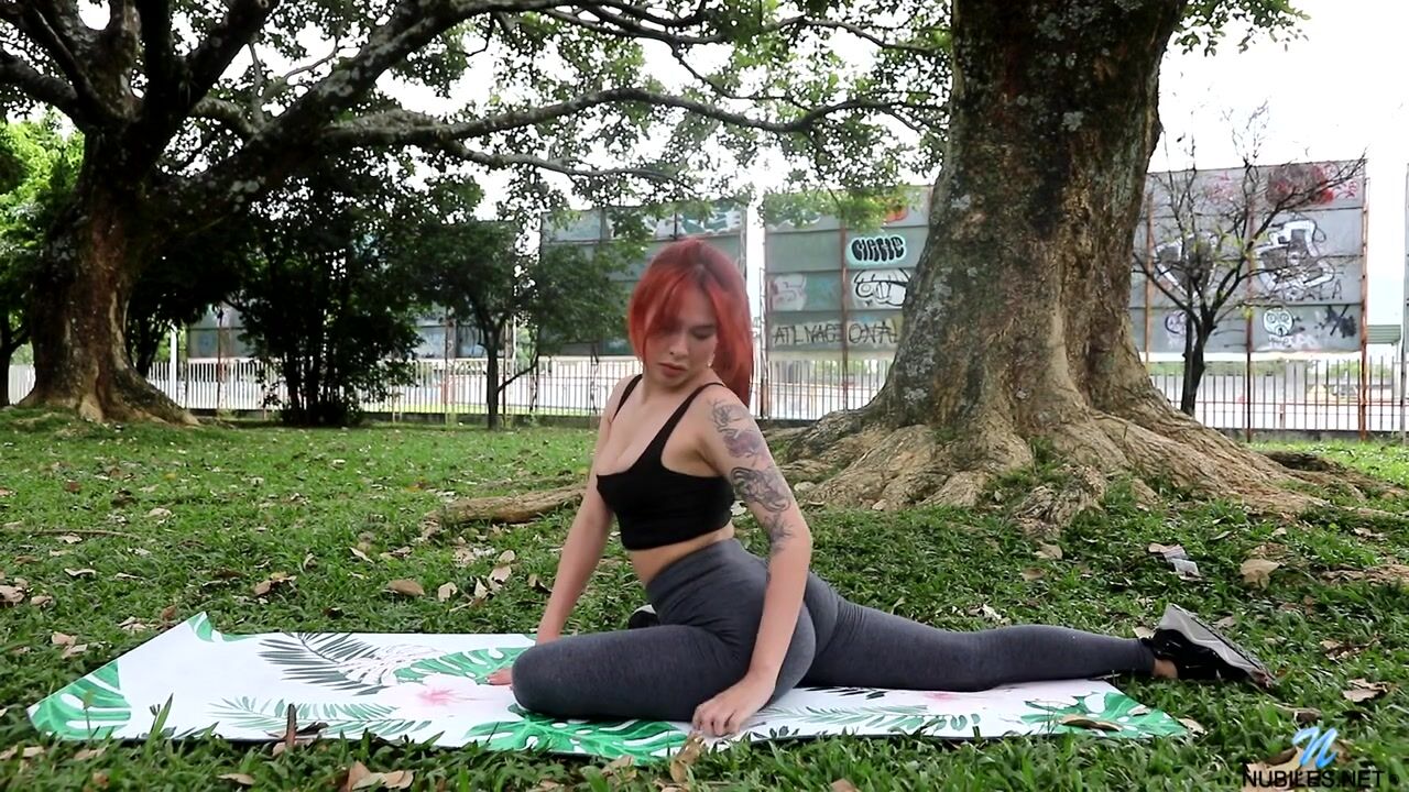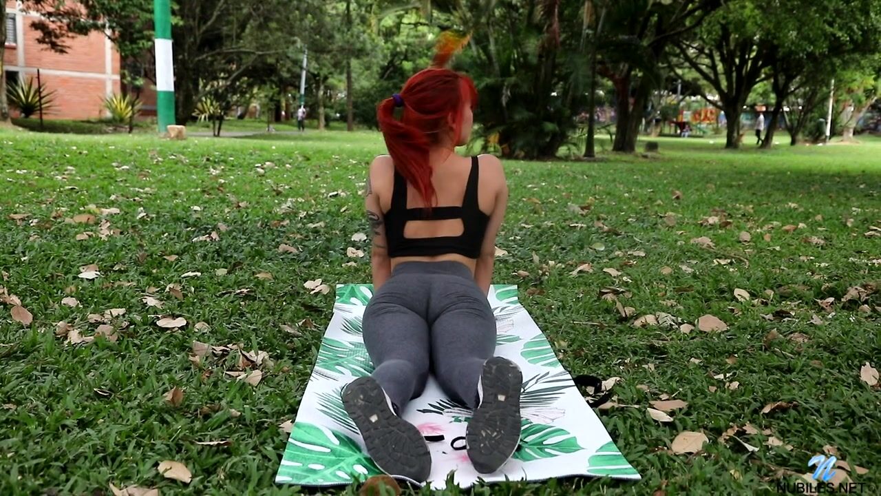 Рыжая Вайолет Придз мастурбирует в спальне после йоги в городском парке